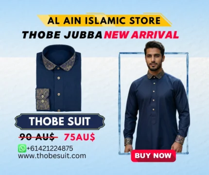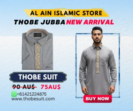 Al Ain Islamic Store, we offer a premium collection of high-quality thobes, jubbahs, and traditional Islamic suits in Australia at best prices. Our range includes luxurious Saudi, Emirati, and Arabic-style thobes and jubbahs, perfect for special events like Ramadan Kareem, Eid, weddings, or everyday wear with finest PV Blended Fabric, Polyester/Viscose materials. We deliver Thobe Jubbah Suits at best prices to all cities in Australia – Sydney, Melbourne, Brisbane, Perth, Adelaide, Hobart, and Canberra. Discover our exquisite range of traditional Islamic attire, crafted with the finest materials for elegance and comfort.
